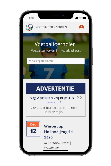 Banner in der Turnierliste auf der Startseite – ideal, wenn Sie noch einige Plätze frei haben. Dieser Banner erscheint nur für Trainer, die nach einer bestimmten Alterskategorie suchen (zum Beispiel U12), damit Sie gezielt mit der richtigen Zielgruppe kommunizieren.