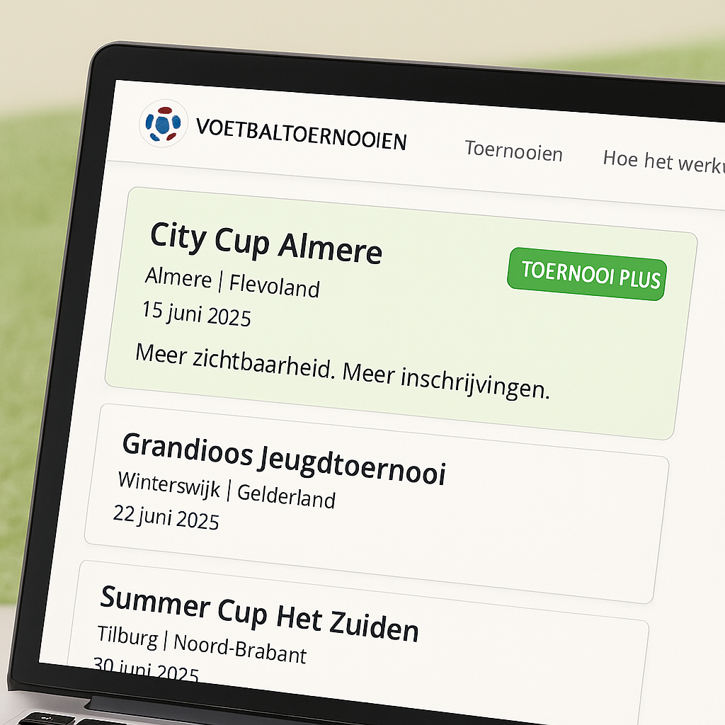 Met Toernooi Plus geef je jouw toernooi een professionele uitstraling en meer controle over hoe het wordt weergegeven op Voetbaltoernooien.info.